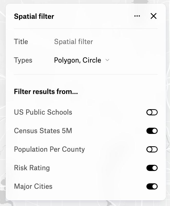 The spatial filter component enables viewers to filter layers and export the filtered results by drawing a shape on the map. Selecting a spatial filter shows the number of features filtered, along with details about the size and shape of the filtered region.