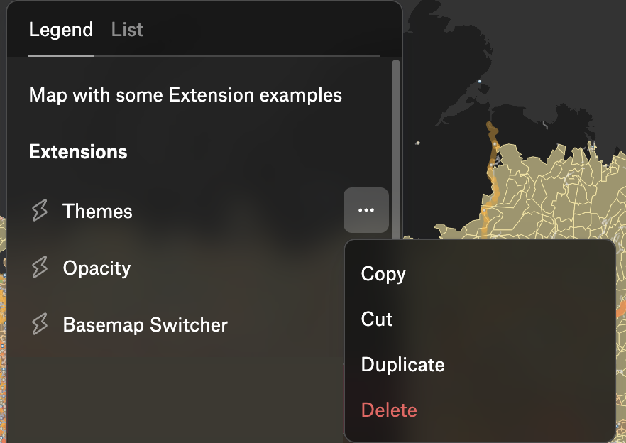 * Click on **`...`** next to the extension in the legend to copy, cut, duplicate, and delete extensions.
